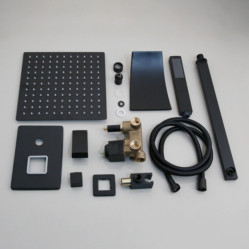 12" Black Bathroom Shower Faucet Set Square Shower Head Tub Mixer Wall Mount Tap