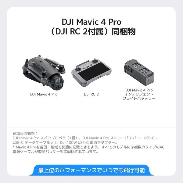 付属品‎DJI 100W USB-C 電源アダプター x 1, DJI Mavic 4 Pro x 1, DJI Mavic 4 Pro インテリジェント フライトバッテリー x 1, DJI Mavic 4 Pro ストレージ カバー x 1, DJI Mavic 4 Pro スペアプロペラ(1組), DJI RC 2 × 1, USB-C − USB-C データケーブル x 2