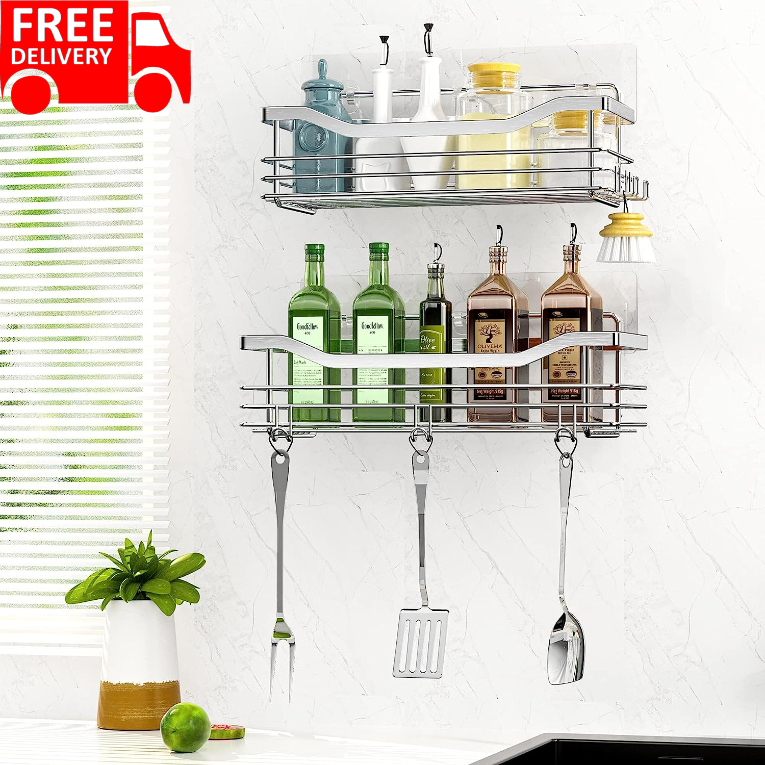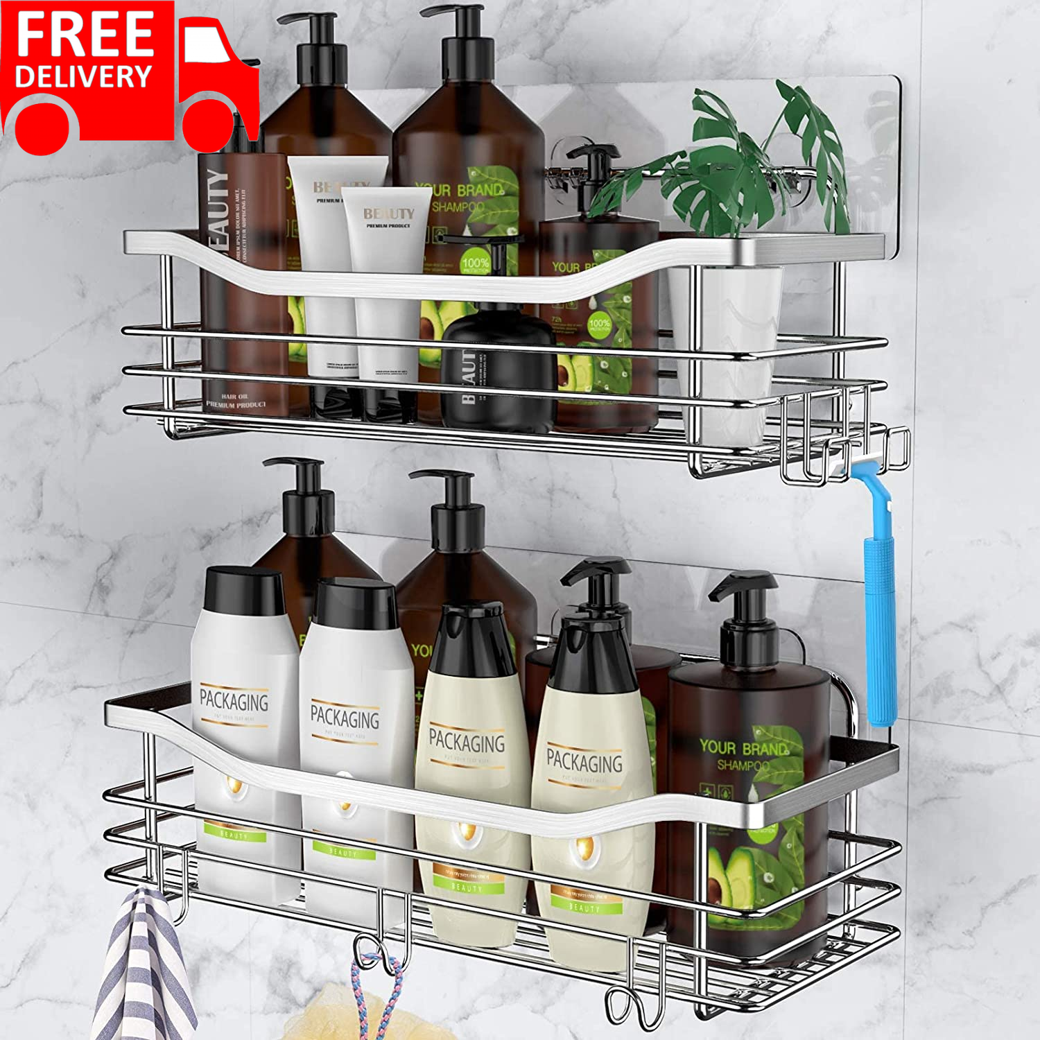 Shower Caddy Basket Shelf with 5 Hooks Adhesive Organizer Storage Rack Rustproof